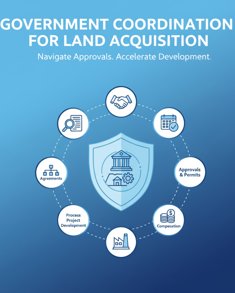 By acting as a single-window liaison, we minimize delays, streamline processes, and reduce bureaucratic challenges, so you can focus on your business rather than paperwork.- Coordinating with government bodies for land allotment and approvals.