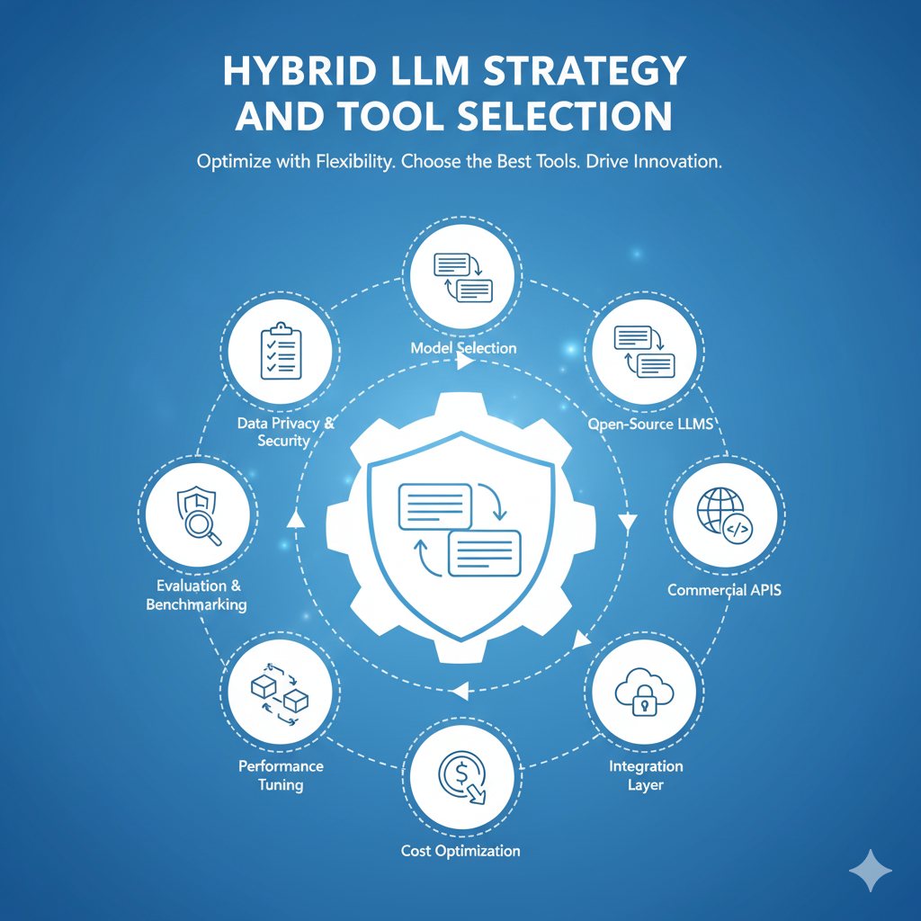 Hybrid LLM Strategy and Tool Selection is the advisory service that helps companies choose, combine, and deploy the optimal mix of LLM customization techniques and hosting models for maximum business impact. Recognizing that no single model or method is a “silver bullet,” this service creates a bespoke architecture that often blends fine-tuning (for specialized style and task mastery) with Retrieval-Augmented Generation (RAG) (for real-time, factually grounded answers). We then select the best combination of open-source models, proprietary cloud APIs (e.g., GPT, Claude, Gemini), and supporting orchestration tools (LangChain, LlamaIndex, vector databases) to optimize for accuracy, cost, latency, and compliance.