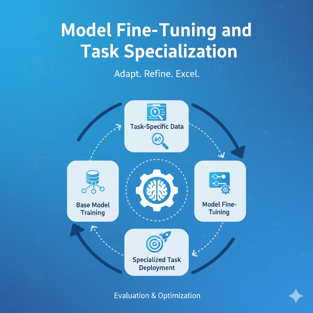 Model Fine-Tuning and Task Specialization is the targeted process of adapting a pre-trained Large Language Model (LLM) to consistently perform a specific business function or generate content in a unique style. Unlike RAG which adds external knowledge at query time, fine-tuning modifies the model’s internal parameters using a small, high-quality, labeled dataset. This technique is used to embed complex instructions, domain-specific terminology (jargon), and a desired tone/format directly into the model, resulting in superior performance for tasks like classification, sentiment analysis, code generation, and producing highly standardized, reliable, and compliant outputs.