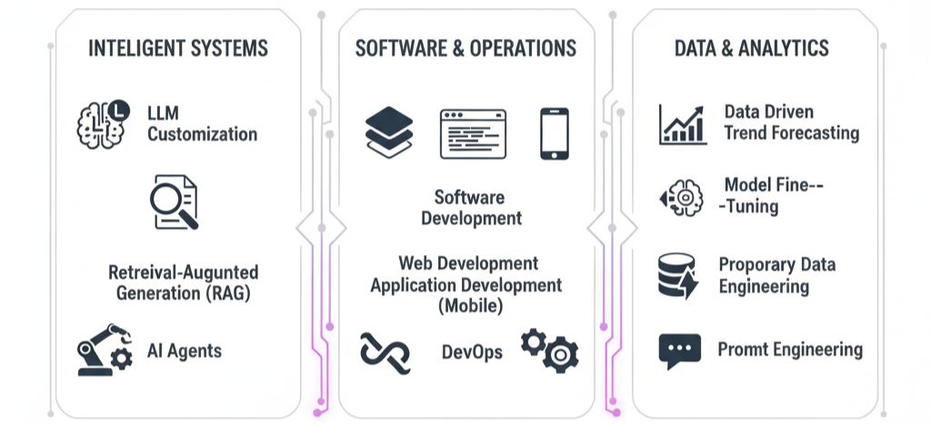 We offer a full spectrum of advanced technology services designed to help businesses innovate, optimize, and scale in the digital economy. Our solutions span AI, Machine Learning, software engineering, and infrastructure operations, ensuring you have the tools to build what’s next and maintain a competitive advantage.