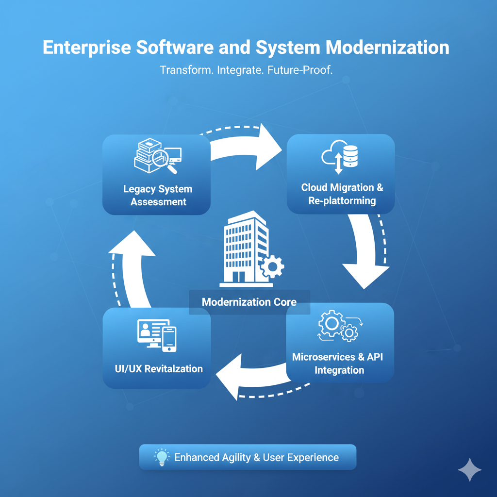 Enterprise Software and System Modernization is the strategic overhaul of an organization’s mission-critical, often legacy, applications and infrastructure to meet the demands of modern business. This service moves away from rigid, outdated systems (like older ERPs or CRMs) to adopt cloud-native architectures, microservices, and modern programming stacks. The goal is to reduce crippling maintenance costs, enhance security, improve data visibility for decision-making, and increase the agility of core business processes like finance, human resources, and supply chain management.