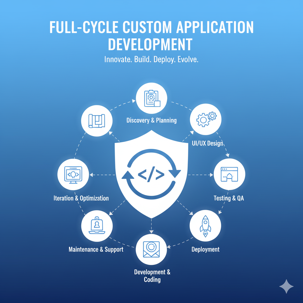 Full-Cycle Custom Application Development is the comprehensive service that transforms a business idea into a fully functional, enterprise-ready software solution. This end-to-end approach manages the entire product journey, from the initial strategic consultation and design to technical implementation, rigorous testing, deployment, and long-term maintenance. By providing a single, accountable team to handle every layer (full-stack), this service ensures the final product is perfectly customized to the client’s workflows, highly scalable, and built with integrated quality assurance to guarantee long-term stability and success.