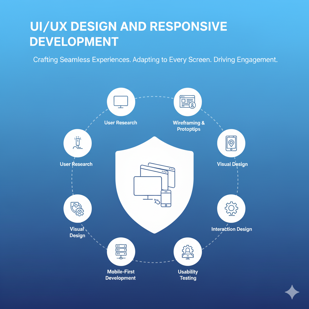 UI/UX Design and Responsive Development is the discipline focused on crafting digital products that are intuitive, efficient, and enjoyable for every user, regardless of the device they use. UX (User Experience) involves strategic research and planning to map the user journey, ensuring the product solves a real problem simply and effectively. UI (User Interface) focuses on the visual design, branding, and interactive elements. Combined with Responsive Development, this service guarantees the layout, navigation, and functionality adapt fluidly to screen sizes from large desktops to small smartphones (mobile-first approach), resulting in higher engagement, lower bounce rates, and a consistent, professional brand image.